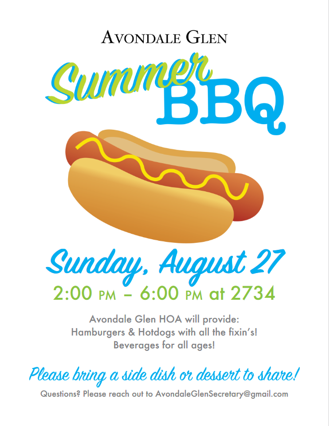 Reminder: HOA BBQ Sunday Posted by avondaleglen 0 Share this: Share on X (Opens in new window) X Share on Facebook (Opens in new window) Facebook Like Loading... Related